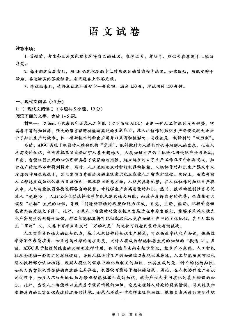 重庆市第八中学校2025届高考适应性月考卷(七)语文