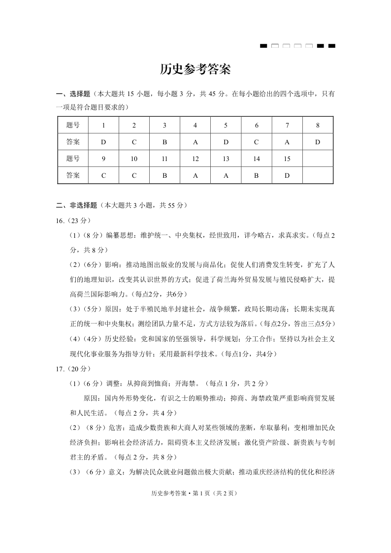 重庆市第八中学校2025届高考适应性月考卷(七)历史答案