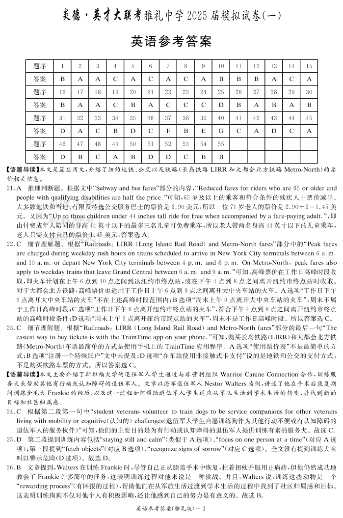 湖南省炎德·英才大联考雅礼中学 2025 届模拟试卷(一)英语答案