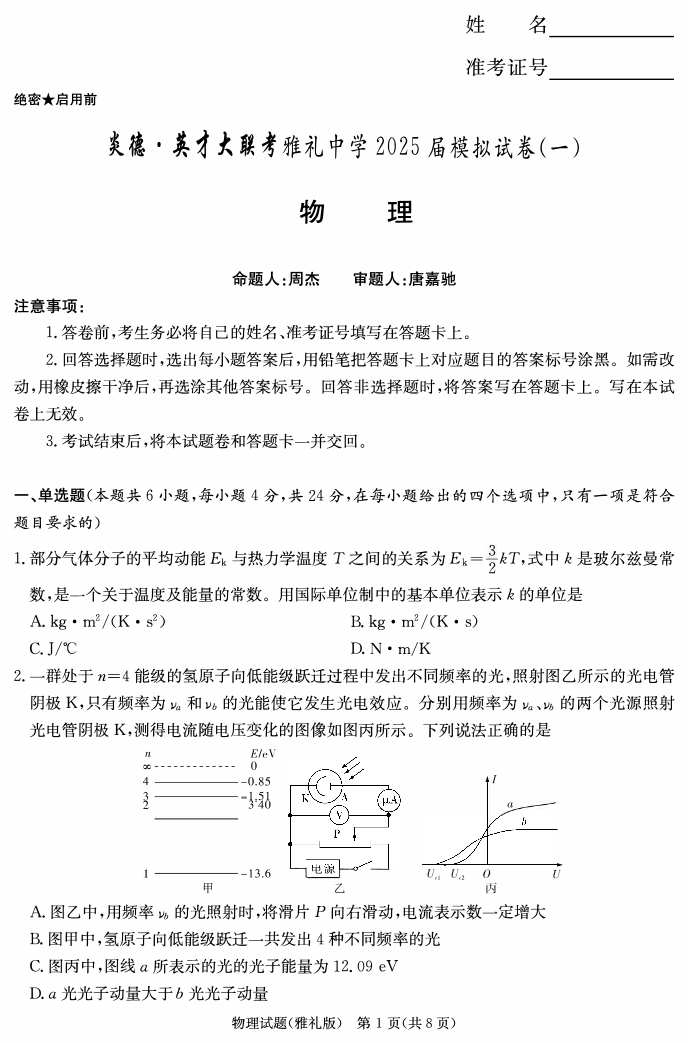 湖南省炎德·英才大联考雅礼中学 2025 届模拟试卷(一)物理
