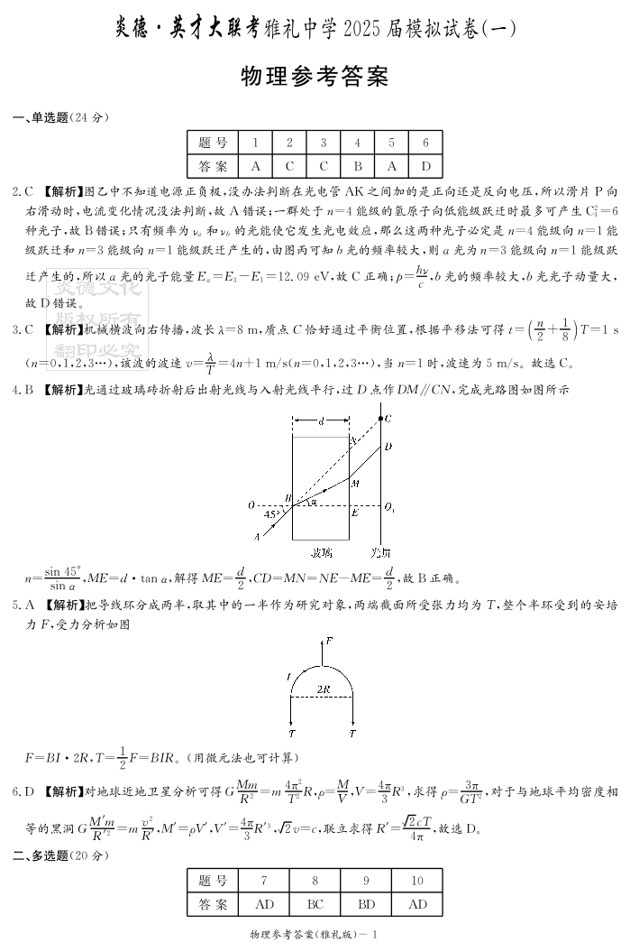 湖南省炎德·英才大联考雅礼中学 2025 届模拟试卷(一)物理答案