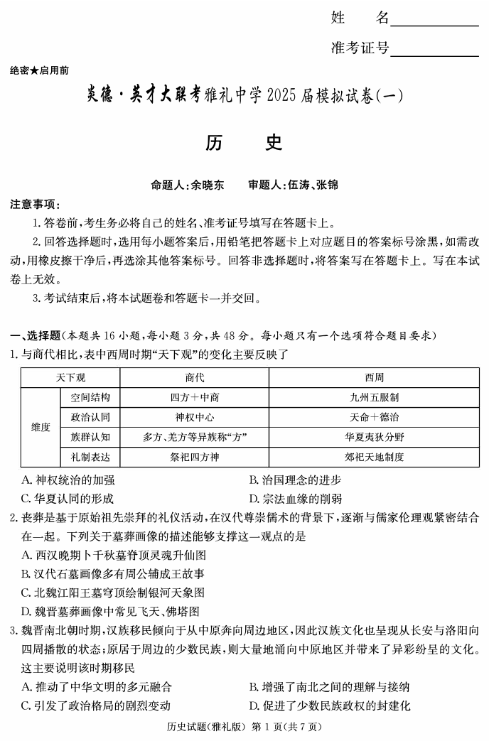 湖南省炎德·英才大联考雅礼中学 2025 届模拟试卷(一)历史