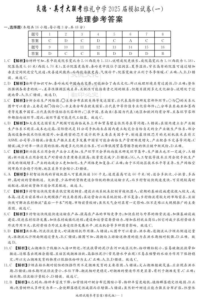 湖南省炎德·英才大联考雅礼中学 2025 届模拟试卷(一)地理答案