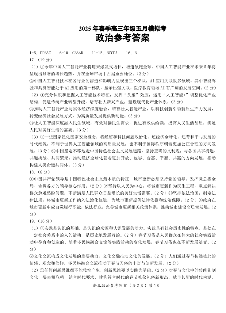 湖北省鄂东南高中学校2025年春季高三年级五月模拟考政治答案