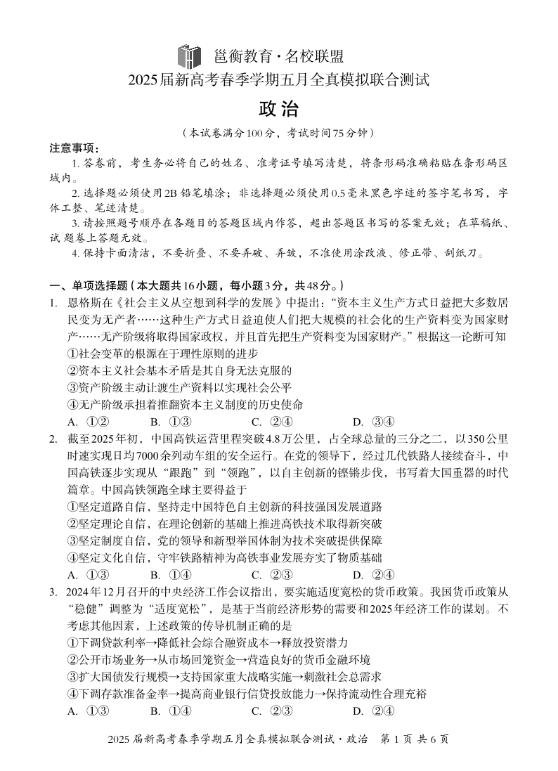 广西邕衡教育名校联盟2025届期新高考春季5月全真模拟测试政治
