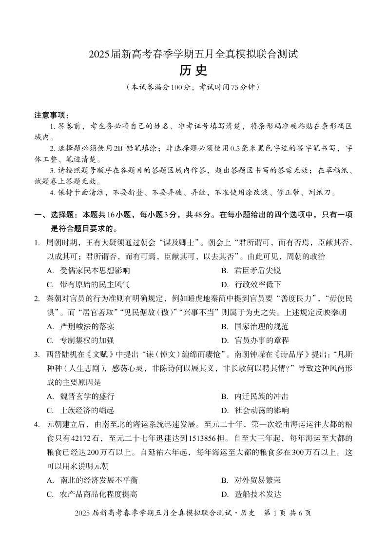 广西邕衡教育名校联盟2025届期新高考春季5月全真模拟测试历史