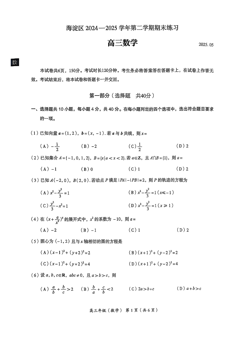 北京市海淀区2024-2025学年下学期高三期末练习(二模)数学+答案