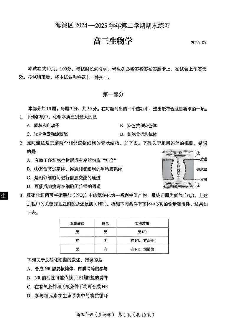 北京市海淀区2024-2025学年下学期高三期末练习(二模)生物+答案