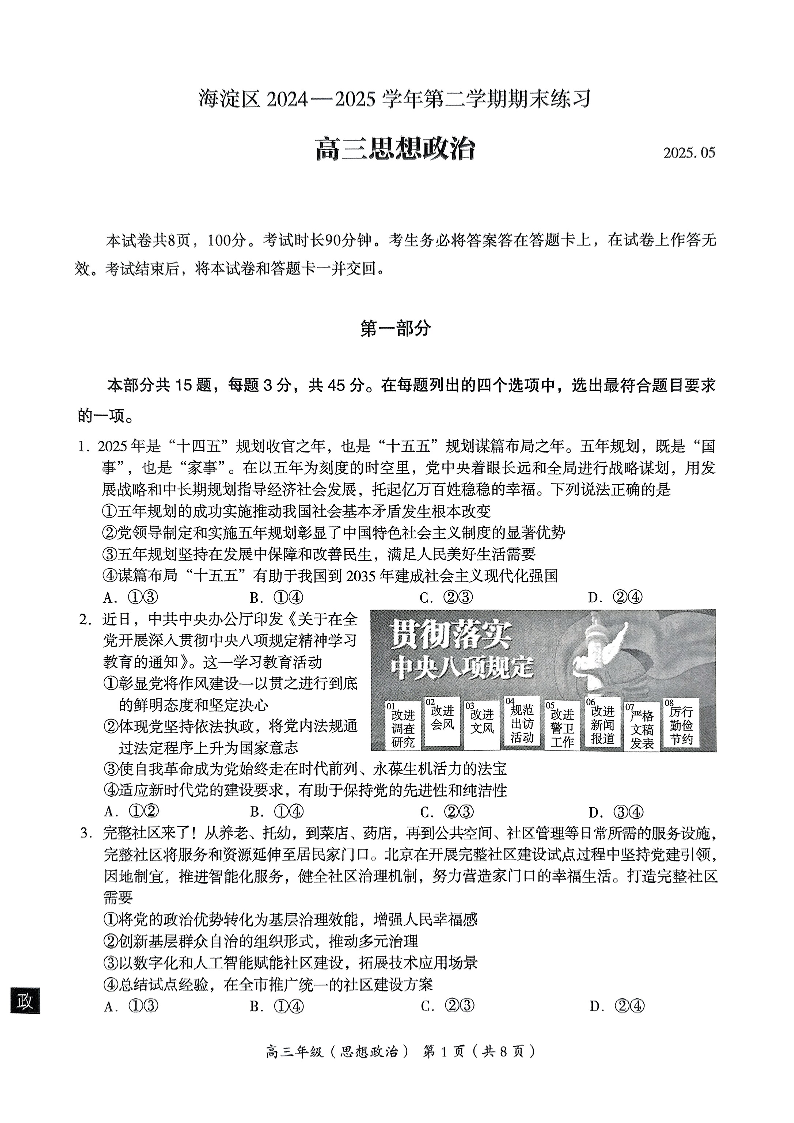 北京市海淀区2024-2025学年下学期高三期末练习(二模)政治+答案