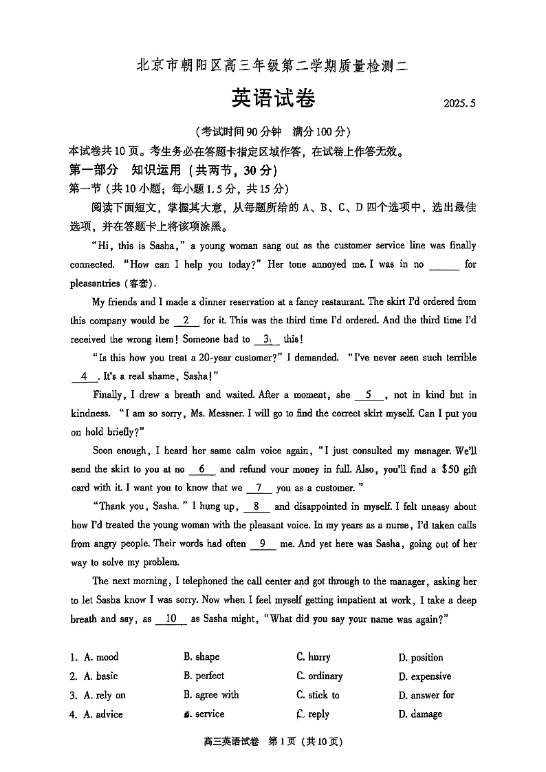 北京市朝阳区2024-2025学年第二学期高三二模质量检测英语+答案