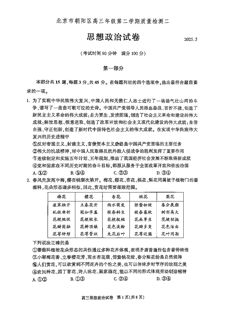 北京市朝阳区2024-2025学年第二学期高三二模质量检测政治+答案
