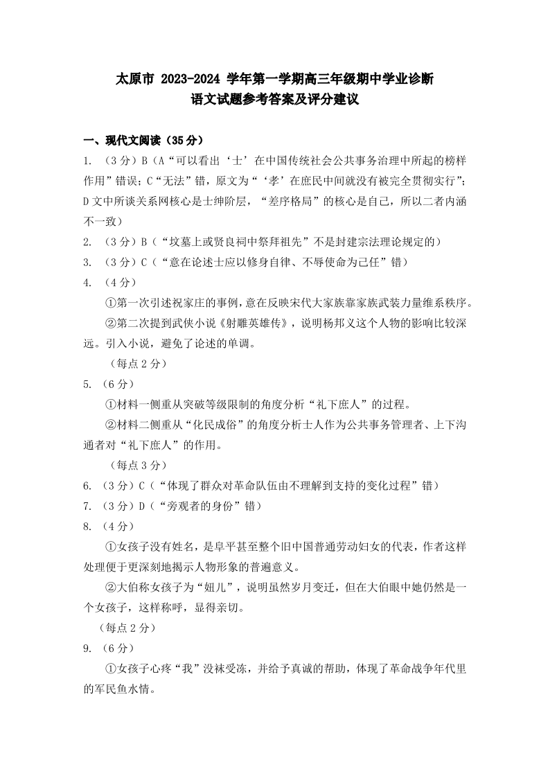 山西省太原市2024届高三上学期期中学业诊断语文答案