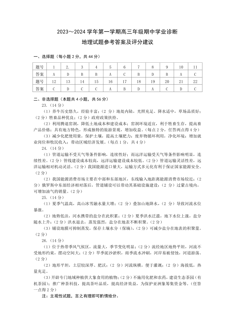 山西省太原市2024届高三上学期期中学业诊断地理答案