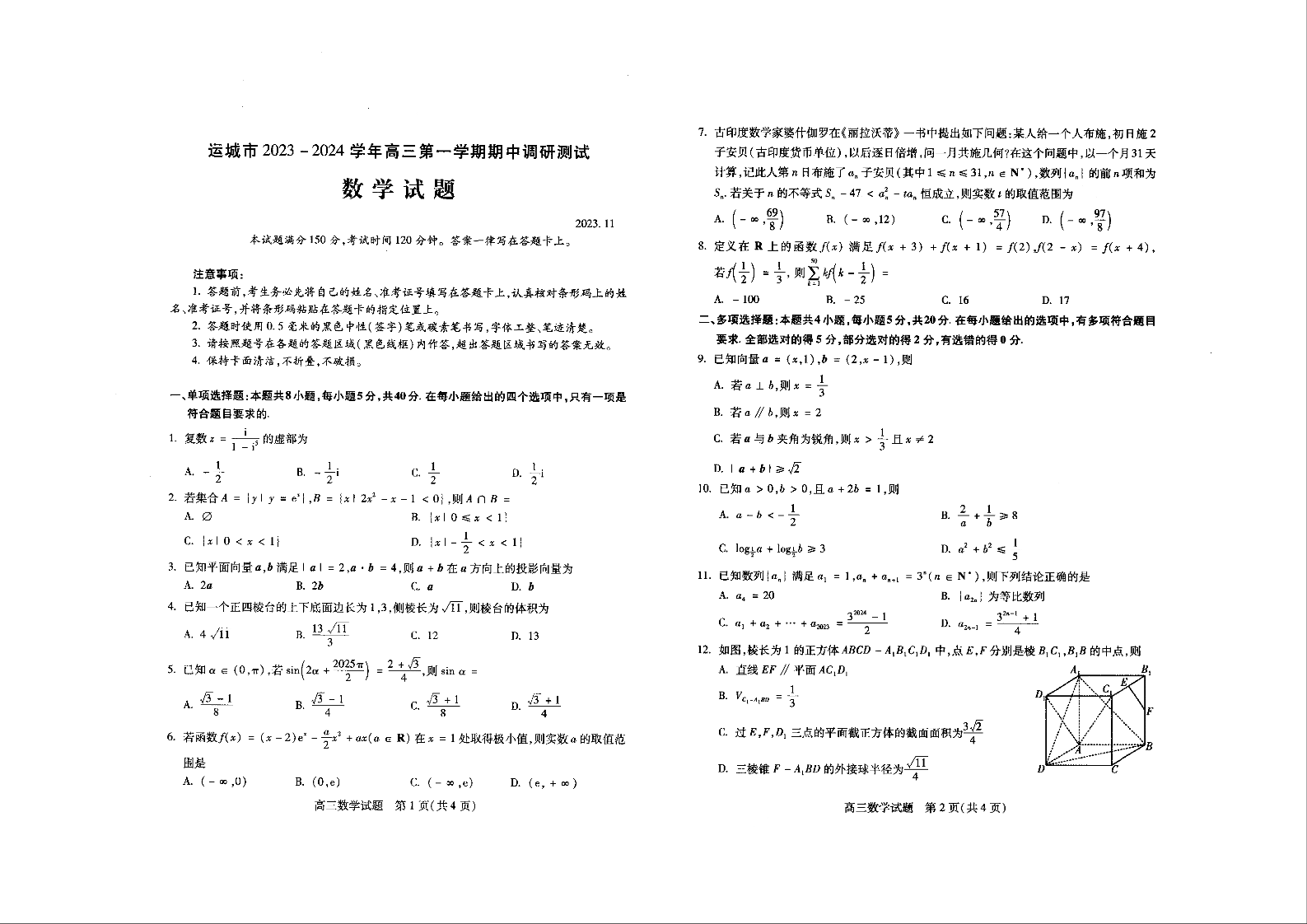 山西省运城市2024届高三上学期11月期中考试数学