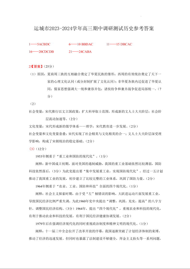 山西省运城市2024届高三上学期11月期中考试历史答案