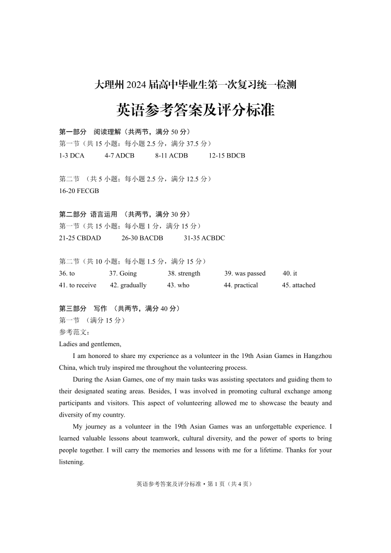云南省大理州2024届高三毕业生第一次复习统一检测英语答案