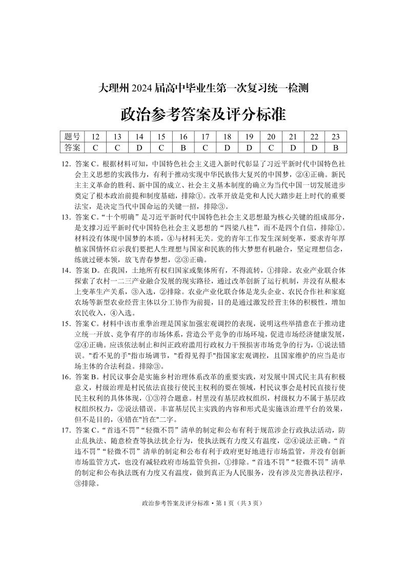 云南省大理州2024届高三毕业生第一次复习统一检测文综答案