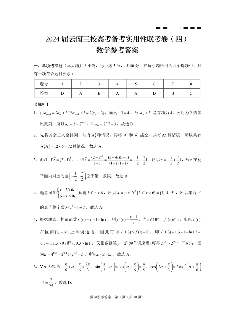 云南省三校2024届高三高考备考实用性联考卷(四)数学答案