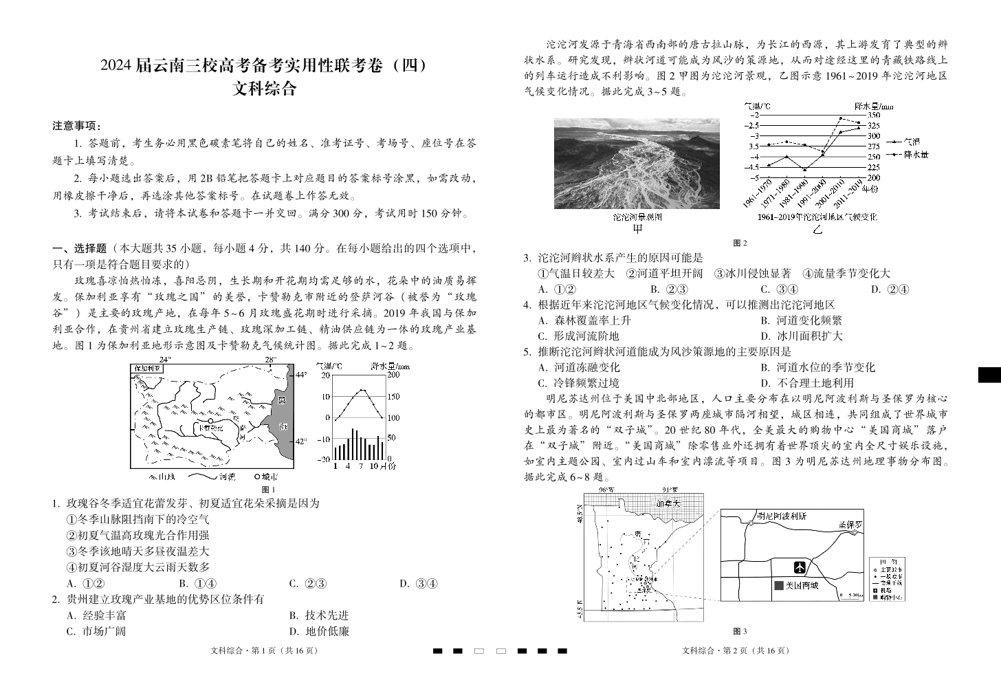 云南省三校2024届高三高考备考实用性联考卷(四)文综