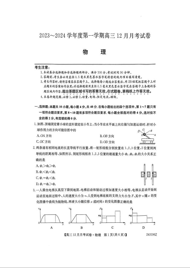 山西省吕梁市孝义市2023-2024学年高三上学期12月月考 物理