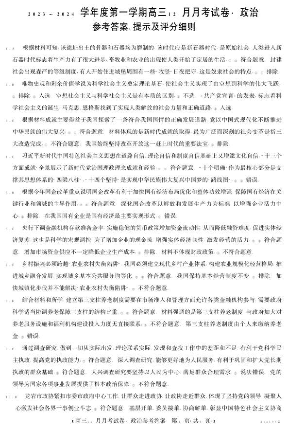 山西省吕梁市孝义市2024届高三上学期12月月考政治答案