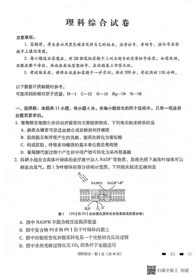 云南师范大学附属中学2024届高三上学期高考适应性月考卷(六)理科综合