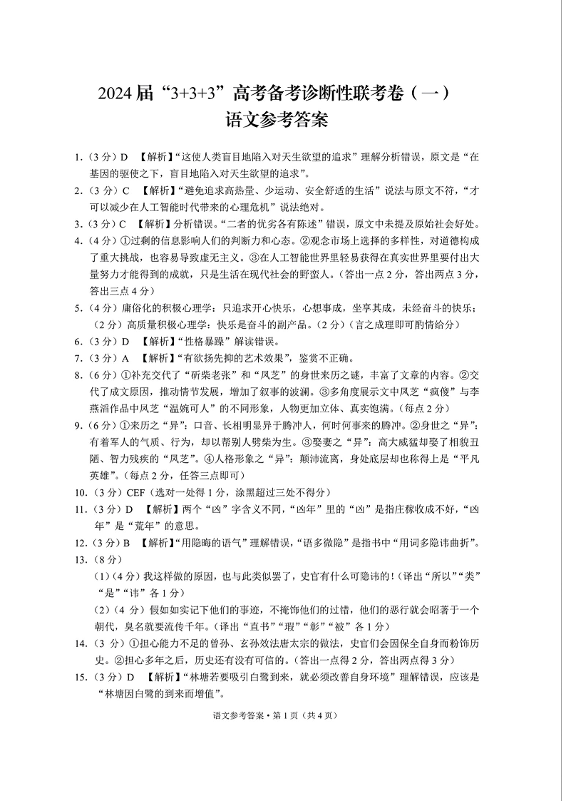 云南省2024届3+3+3高考备考诊断性联考卷(一)语文答案