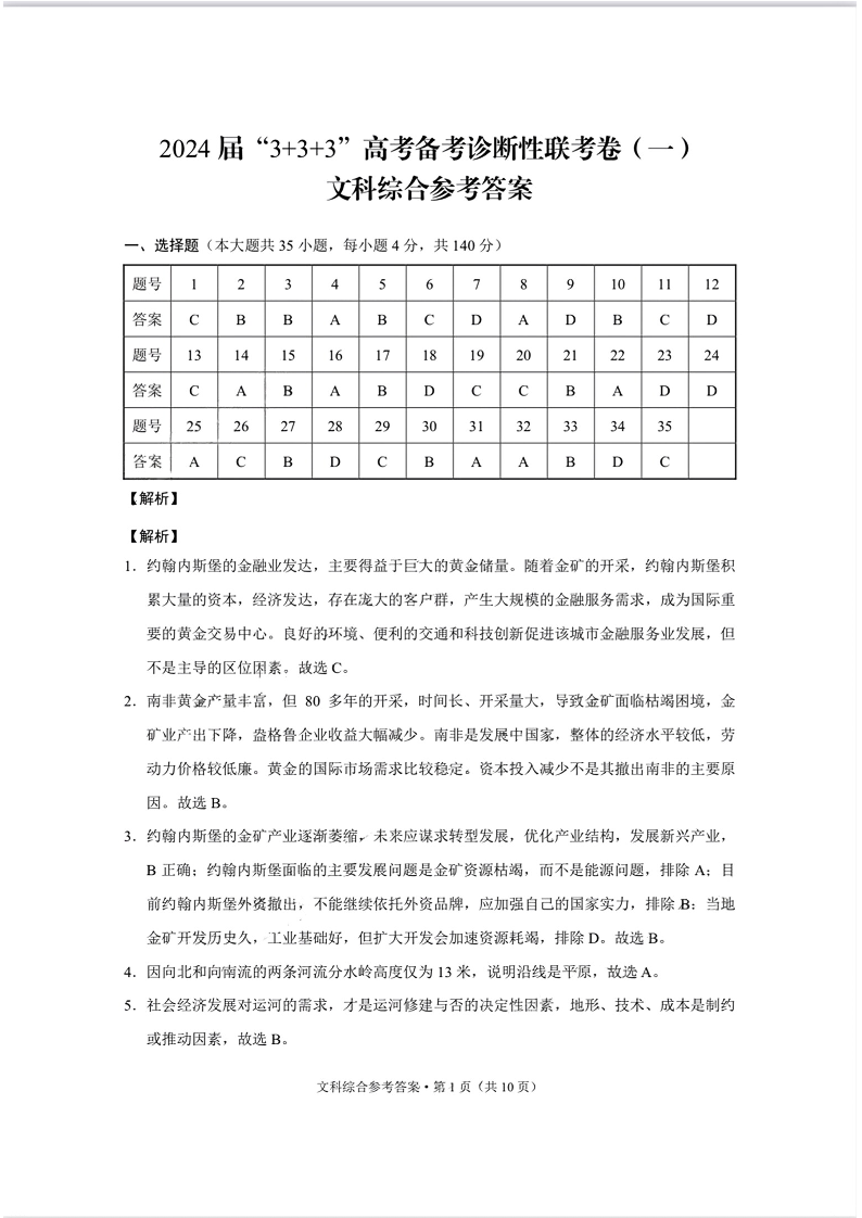 云南省2024届3+3+3高考备考诊断性联考卷(一)文综答案