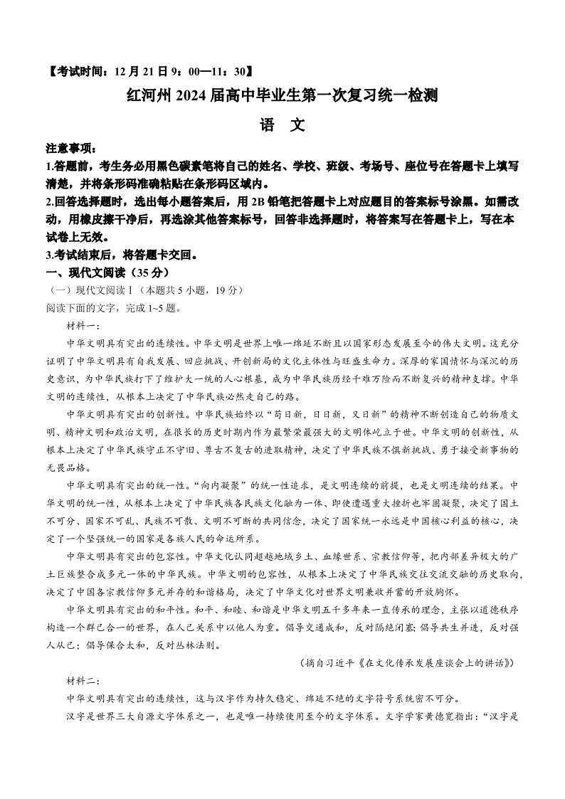 云南省红河州2024届高中毕业生第一次复习统一检测语文