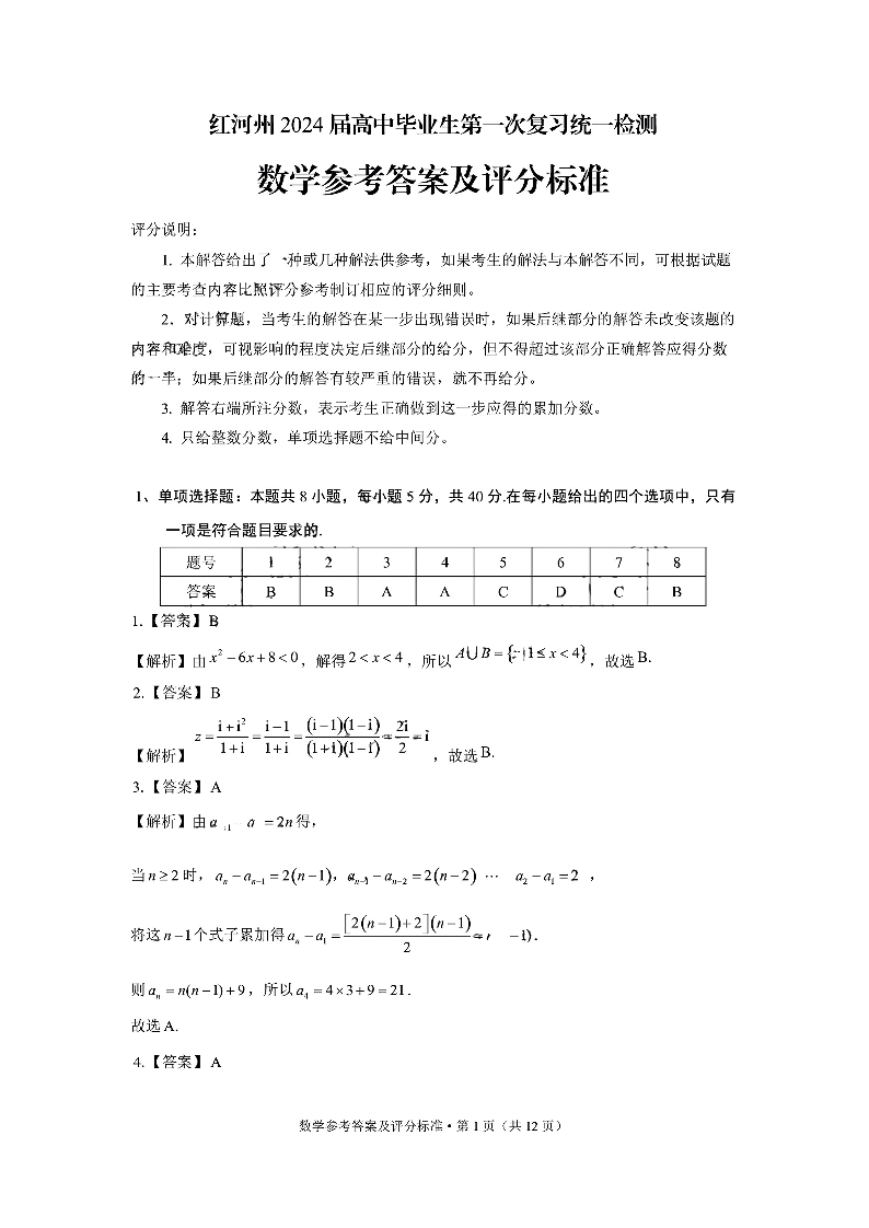 云南省红河州2024届高中毕业生第一次复习统一检测数学答案
