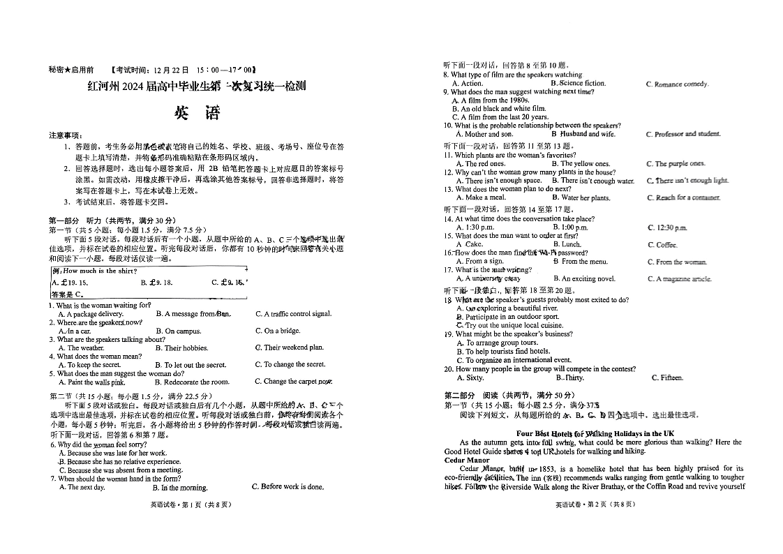 云南省红河州2024届高中毕业生第一次复习统一检测英语