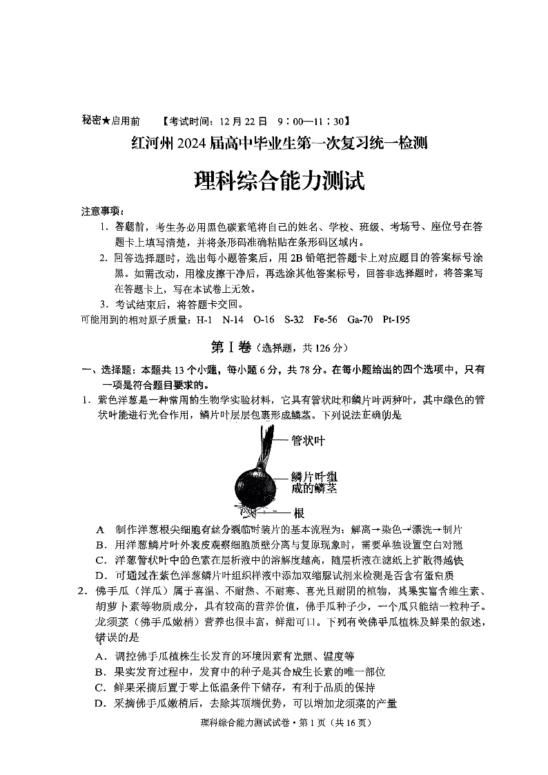 云南省红河州2024届高中毕业生第一次复习统一检测理综