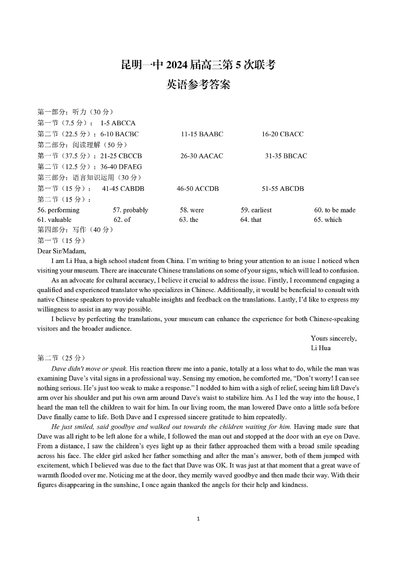 云南省红河州2024届高中毕业生第一次复习统一检测英语答案