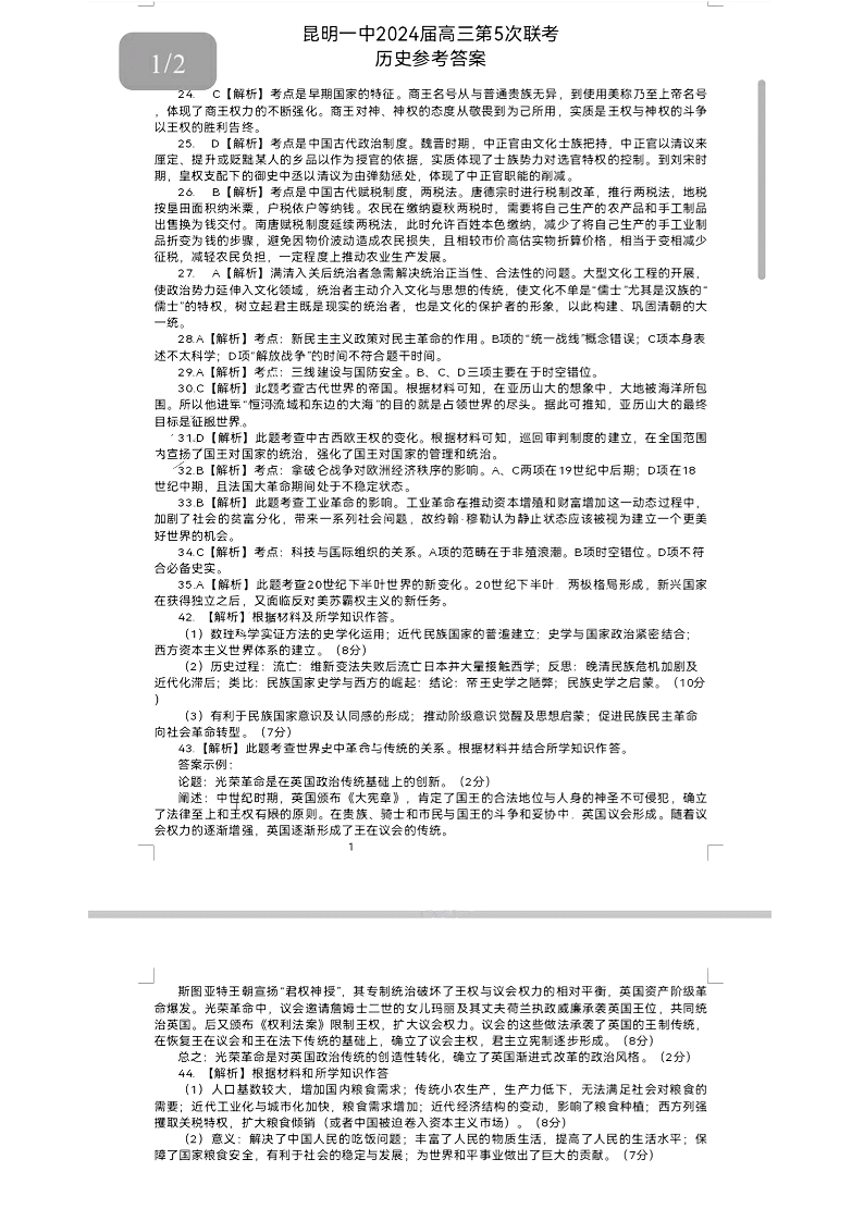 云南省红河州2024届高中毕业生第一次复习统一检测文综答案