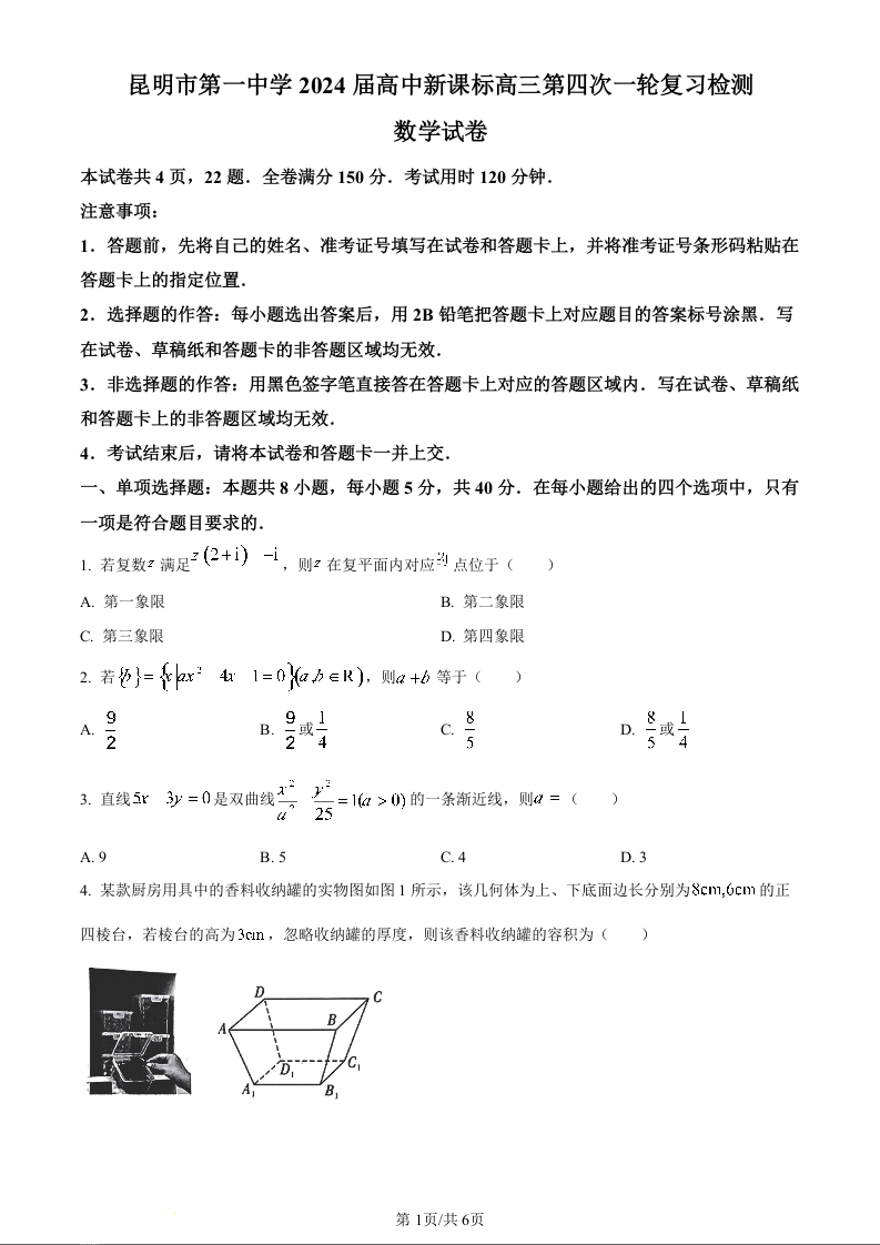 云南省昆明市第一中学2024届高中新课标高三第四次一轮复习检测数学(原卷版)