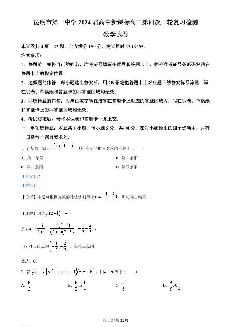 云南省昆明市第一中学2024届高中新课标高三第四次一轮复习检测数学(精品解析版)