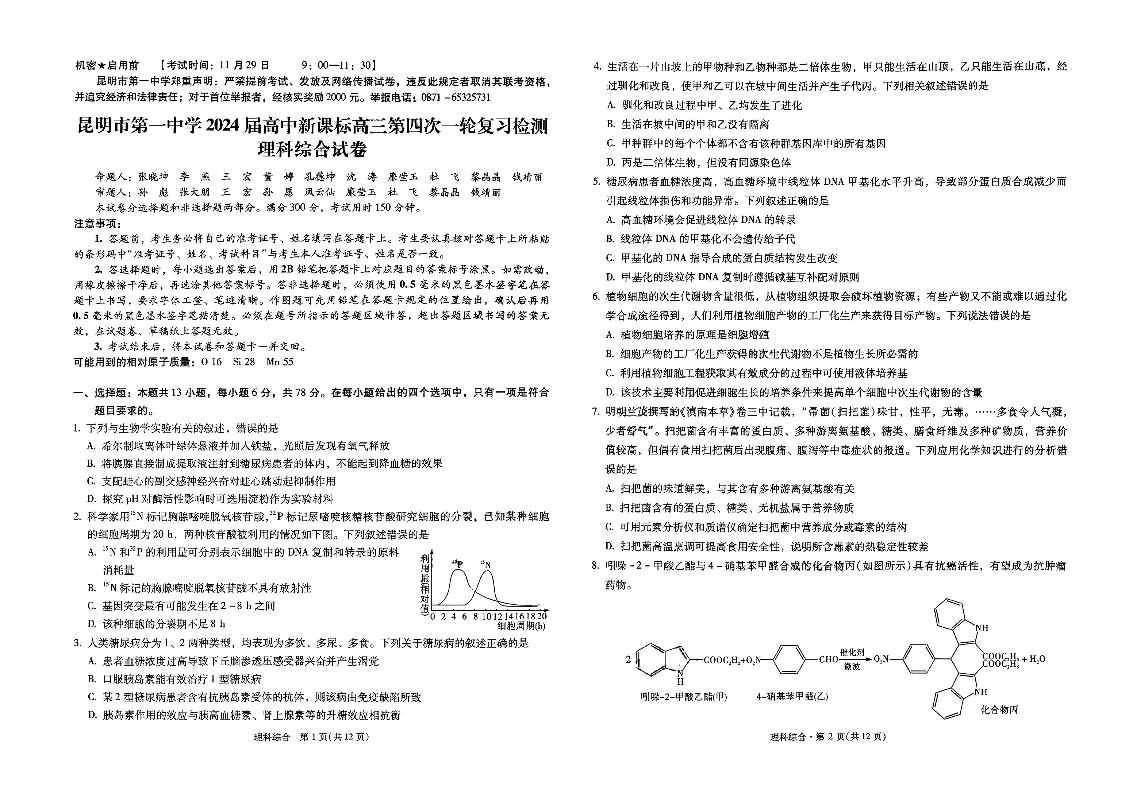 云南省昆明市第一中学2024届高中新课标高三第四次一轮复习检测理科综合