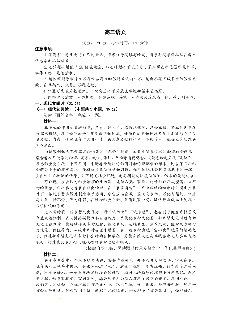 安徽省池州市2024届高三上学期1月期末考试语文+答案