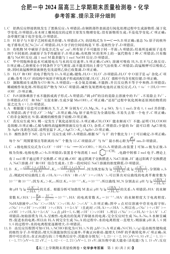 安徽省池州市2024届高三上学期1月期末考试化学答案