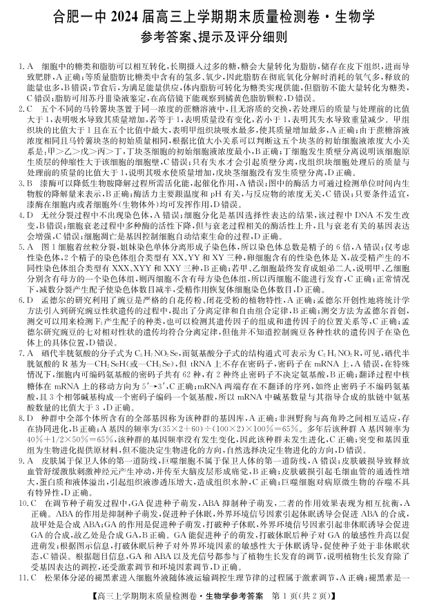安徽省池州市2024届高三上学期1月期末考试生物答案