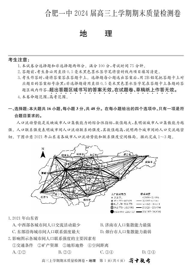 安徽省池州市2024届高三上学期1月期末考试地理+答案