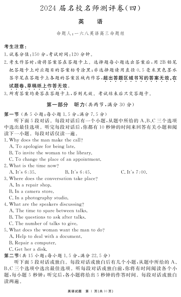 安徽省合肥一六八中学2024届高三上学期名校名师测评卷(四)英语