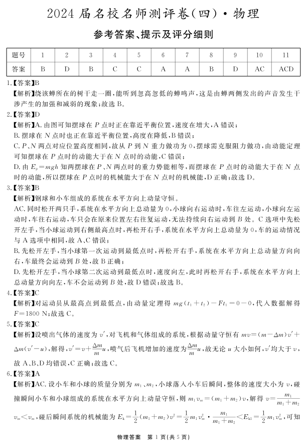 安徽省合肥一六八中学2024届高三上学期名校名师测评卷(四)物理答案
