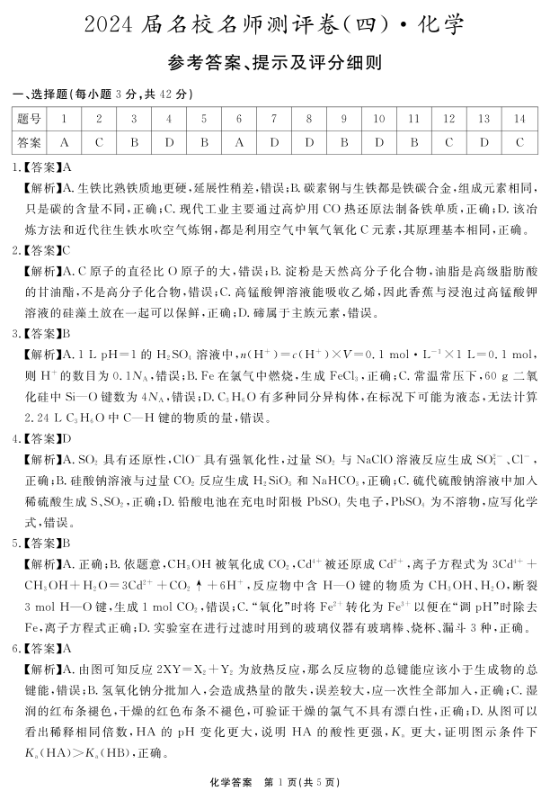 安徽省合肥一六八中学2024届高三上学期名校名师测评卷(四)化学答案