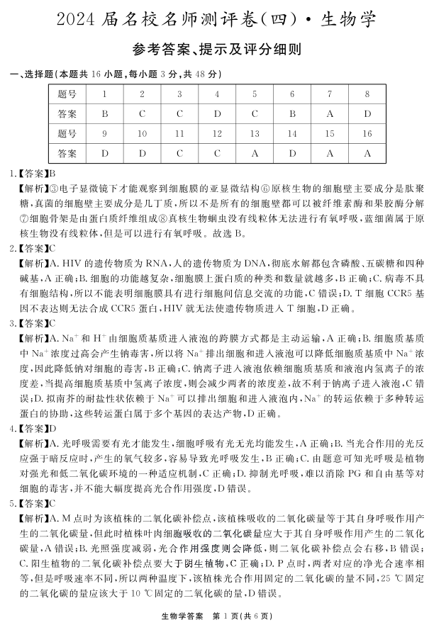安徽省合肥一六八中学2024届高三上学期名校名师测评卷(四)生物答案