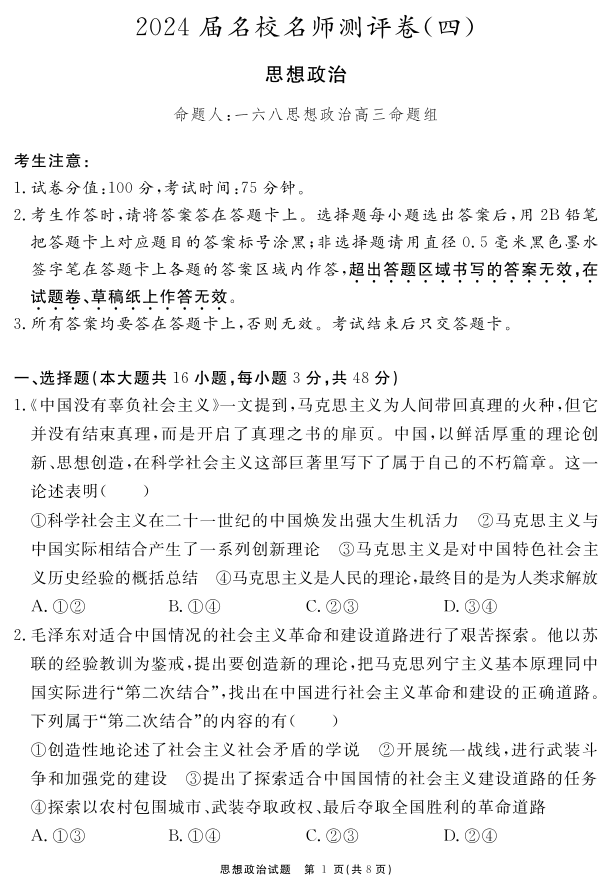安徽省合肥一六八中学2024届高三上学期名校名师测评卷(四)政治