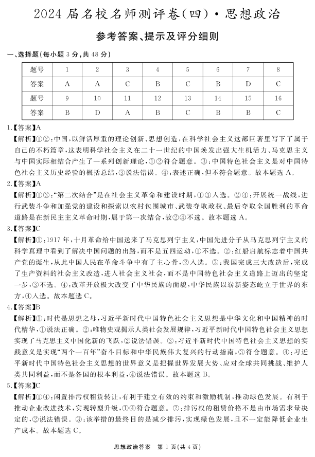 安徽省合肥一六八中学2024届高三上学期名校名师测评卷(四)政治答案