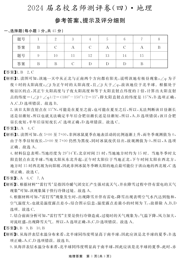 安徽省合肥一六八中学2024届高三上学期名校名师测评卷(四)地理答案