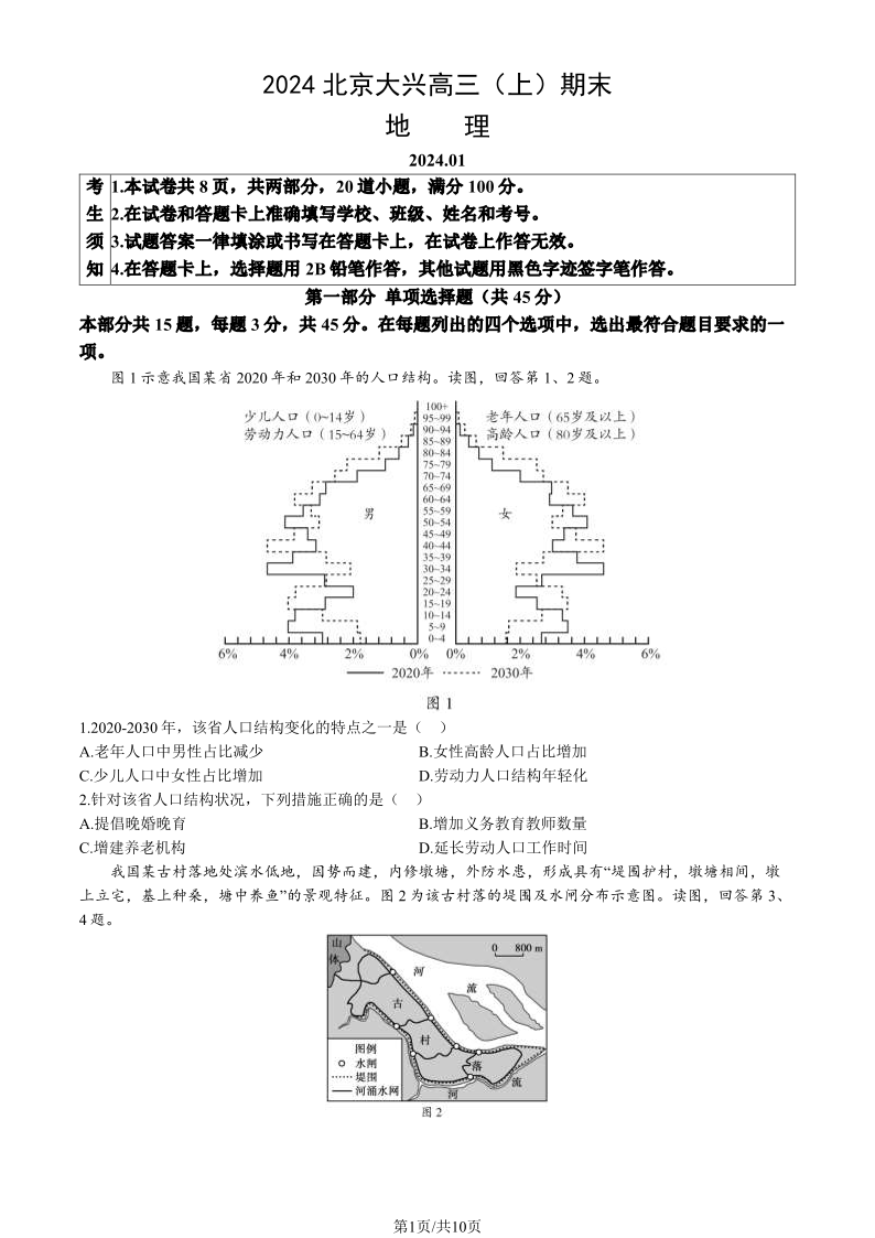 北京大兴区2024届高三1月期末考试地理