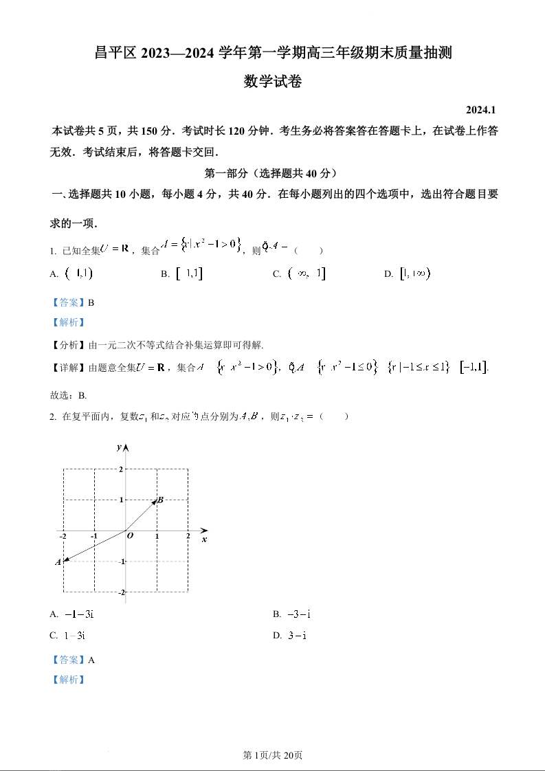 北京市昌平区2024届高三上学期期末考试数学(精品解析版)